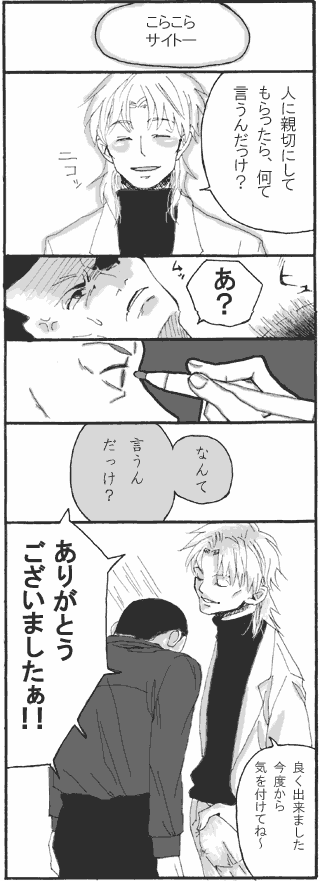 ゴ○ブリのような輝きのアイパッチの完成です 礼節は大切に、親切にしてもらったらありがとうを 下から2コマ目は魅惑のトグボイスが耳元に囁く感じでお願いします 頑張れ、サイトー