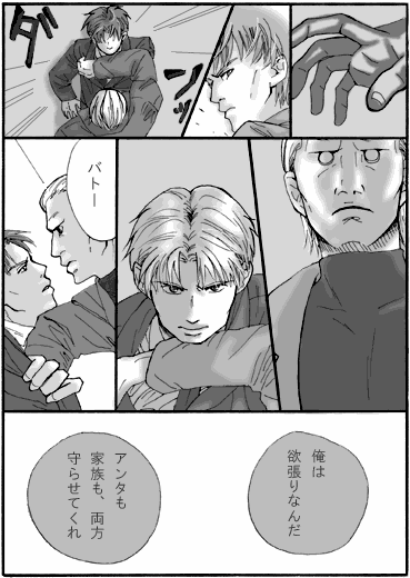 以下クロエとの会話 花「トグとバトー、仲違いしたっぽい?」ク「でもさ、トグサは元々バトーの言うこと素直に聞いてはいなかったよね。少佐の言うことは聞くけど」 花「確かに。じゃ今までと変わんない、と」 つまりきっと変わらずいちゃこらしている、という結論に達しました これもカップリングのつもりで描いてないんだけど、見返すとカップリング表記にした方がいいような… トグサの髪に色を塗るのがすごい違和感ありました