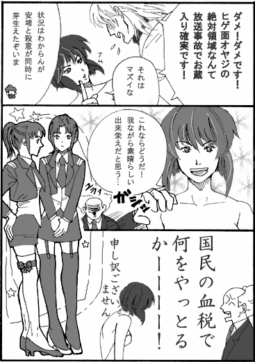 今年(2006)はニーソックスの子がすごい多くてほくほくしてます 少佐も可愛い物が好きだといい でも自分には似合わないからってくるたんとかを着飾らせてるとなおいい そして女の子が描きたかっただけな私 イシカワの絶対領域は、ある層でものすごい数字取れると思います